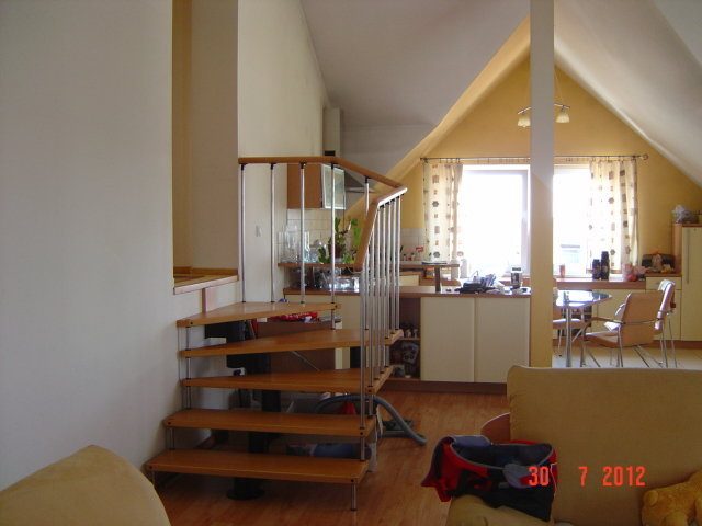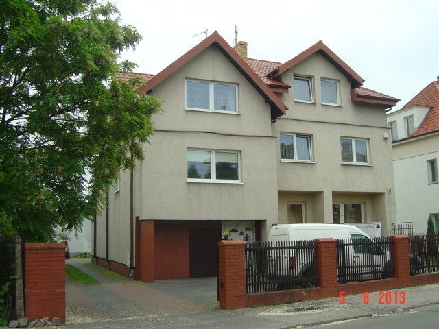Działka ogrodzona, metalowa krata na podmurówce. W piwnicy (ca 50 m2) jest garaż i pomieszczenie gospodarcze, następny poziom, ok. 105 m2 - to przyziemie plus parter, potem piętro z dwoma lokalami (lokal użytkowy z tarasem i mieszkanie, razem również ca 105 m2), dalej poddasze (lokal mieszkalny 110 m2) i najwyższy poziom - strych.