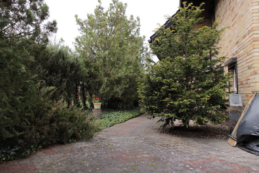 Całość otoczona tujami i iglakami.